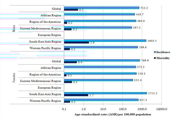 The global ASR of incidence of dengue was 712.21 per 100,000 persons in males and 769.95 per 100,000 persons in females (Figure 3). Both in males and females, the highest ASRs of incidence were found in the South-East Asia region (1603.47 per 100,000 in males and 1755.17 per 100,000 in females), which were about three to five times higher than in all other regions, with the exception of the European region, where no new cases of dengue were registered.