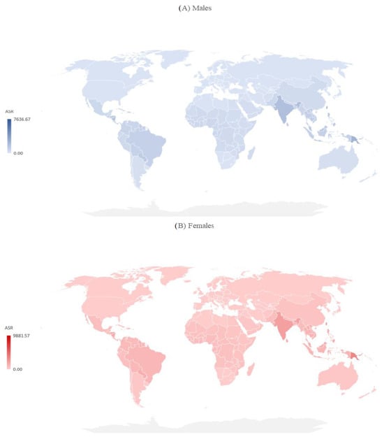 There are significant international differences in the incidence and mortality of dengue by sex in 2019 (Figure 4 and Figure 5). Both in males and females in 2019, the incidence ASRs were the highest in Kiribati, the Northern Mariana Islands, the Seychelles, and Niue (equally, about 7.500 per 100,000 in males and about 9.000 per 100,000 in females), while the lowest ASRs were reported in the United States of America (7.11 per 100,000 in males, 7.19 per 100,000 in females) (Figure 4).