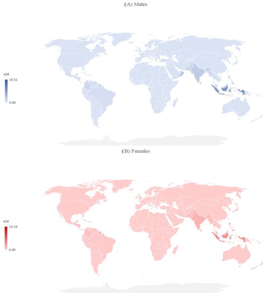 Both in males and females, the ASRs of mortality varied greatly across countries, and the mortality rate was highest in the Solomon Islands (10.51 per 100,000 in males, 14.19 per 100,000 in females), followed by Indonesia (5.52 per 100,000 in males, 4.02 per 100,000 in females) (Figure 5).