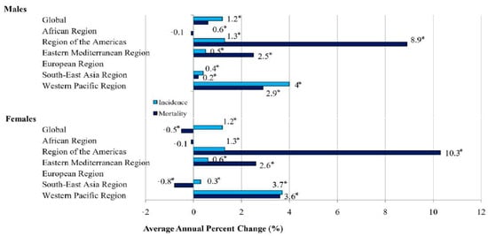 The only exception was the region of Africa, with a stable trend of dengue mortality both in males and females (both equally, by −0.1% per year).