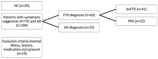 All patients diagnosed with AD, bvFTD, and PPA at the 2nd Department of Neurology of the AHEPA University Hospital of Thessaloniki, Greece, between January 2014 and March 2018 were included in the study. Diagnosis was made by a team of trained clinicians according to current clinical criteria [,,]. All patients with AD (n = 22) presented with early memory impairments that worsened progressively, whereas patients with bvFTD (n = 41) showed personality changes and social conduct disturbances with relatively sparing memory, and patients with PPA (n = 22) showed speech production, object knowledge, and naming disturbances. Individuals were already diagnosed with dementia and were on cholinesterase inhibitors (donepezil or rivastigmine) or were first diagnosed during enrollment.