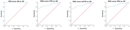 Roc Curve analysis comparing AD vs. HC, FTD vs. HC, bvFTD vs. HC, PPA vs. HC.