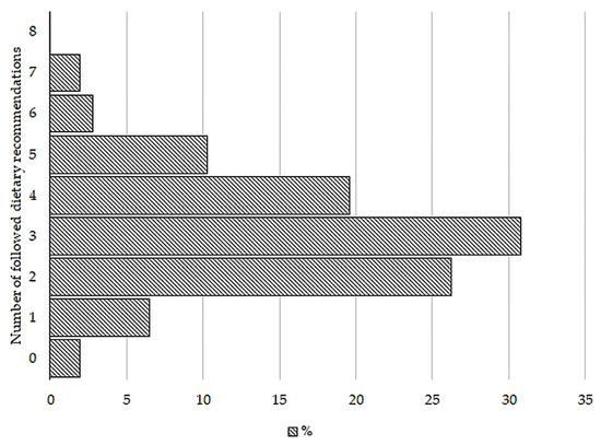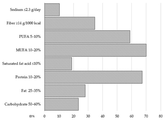 The quantity of followed recommendations. Abbreviations: %; the percentage of subjects who adhered to recommendations. Recommendations that were evaluated are as follows: carbohydrate 50–60%, fat 25–35%, protein 10–20%, saturated fat acid ≤ 10%, monounsaturated fatty acids 10–20%, polyunsaturated fatty acids 5–10% of total energy, fiber ≥ 14 g/1000 kcal, and sodium ≤ 2.3 g/day.