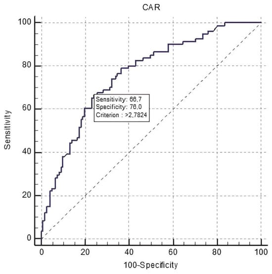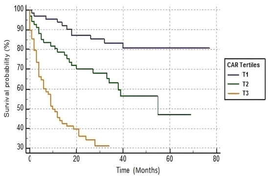 An ROC curve analysis demonstrated that CAR level > 2.78 predicted mortality with a sensitivity of 66.7% and specificity of 76% (AUC: 0.762; 95% CI: 0.697–0.819, p < 0.001) (Figure 1). The Kaplan–Meier survival analysis showed significant differences between tertiles and survival rates according to CAR values (log-rank p = 0.001) (Figure 2).