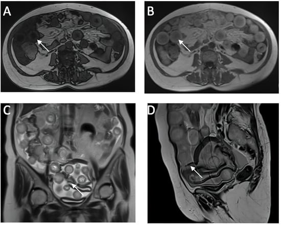 Cross-Sectional MRI Analysis of Abdominal and Pelvic Organs. (A,B) in-phase and op-phase images showing signal dropout on the op phase, suggesting fat content of the sphere (C,D) ruptured cyst wall which is hypointense on the T2w sequence.