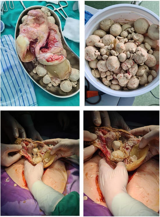 Due to its ability to distinguish different tissue types by their densities, even in very small amounts, CT imaging has a higher sensitivity for diagnosis compared to ultrasound but is less recommended due to ionizing radiation risk. This type of ovarian teratoma exhibits distinct imaging characteristics, which include the presence of low-density spherical masses containing a mix of fat, debris, hair strands, and fluid. Calcifications or the dermoid plug formed from the cyst wall can also be observed. In the case of a ruptured cyst, these hypodense masses are randomly distributed in the abdomen and pelvis, predominantly in the pelvic area, surrounded by the leaked intracystic fluid. In case of a ruptured cyst, the literature emphasizes that the fluid distributes in antidependent pockets, and may lead to chemical peritonitis. This may affect the mesentery and thickening of the peritoneum, closely mimicking peritoneal carcinomatosis [,], as initially suspected in our case through the CT examination. Malignant transformation can be suggested by the enlargement of the cystic ovarian teratoma >10 cm, soft tissue plugs, and the irregular/crenelated appearance of the cyst’s wall. Although the presented teratoma was approximately 14 cm in the largest diameter, malignancy was excluded after histopathological examination. MRI is the investigation reserved for difficult-to-diagnose cases; it is extremely sensitive to fatty structures, and contrast can identify invasive solid components, making it necessary for differentiating malignant elements. It is the preferred investigation for women of childbearing age. On T1-weighted sequences, the spherical masses have a hyperintense periphery compared to the intracystic fluid, which has a hypointense center. In contrast, on T2-weighted sequences, the signal is opposed: hypointense at the periphery and hyperintense in the center. The core section consists predominantly of hair strands and soft tissues, while the main component of the globular masses is represented by fat/sebum, which appears suppressed on fat saturation sequences []. A characteristic sign of these lesions is the “boba sign” [], inspired by a Taiwanese drink called bubble tea, which contains multiple tapioca pearls, having an imaging ap-pearance similar to the globular masses in mature cystic ovarian teratoma. These MRI characteristics of the globular masses were observed in our patient as well, noting that the lesions and intracystic fluid were dispersed throughout the abdomen and pelvis, indicating a complicated ruptured teratoma. In case of a suspected teratoma, the most important MRI sequence is represented by “chemical shift” imaging. Due to the fact that all spheres contain a large amount of fat, in the opposed phase images these spheres present a homogeneous signal drop-out, which makes the diagnosis straight-forward. To our knowledge, this is the first reported case of a ruptured cystic teratoma with ‘floating balls’ that has both CT and MRI imaging, making this case report an extremely useful teaching material.
