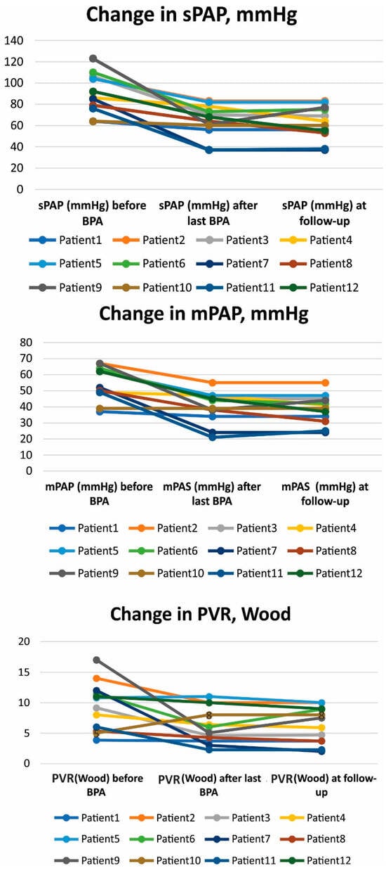 Baseline characteristics of the study population. Twenty-six patients were included in this study. The mean age of the patients was 61.68 years (range 40–80), and 16 (61.5%) were male. All patients were receiving anticoagulant therapy, and 23 (88.5%) were receiving targeted PH therapy: 73.1% of these were treated with Riociguat, 7.7% with a combination of Riociguat and Bosentan, 3.8% with a combination of Sildenafil and Ambrisentan, and 3.8% with Sildenafil monotherapy. Two patients received targeted PH treatment after a single BPA procedure and were not scheduled for further procedures due to lesions in very small vessels. It is important to note that all 12 patients for whom treatment was completed and follow-up results are presented were treated with targeted PH therapy. The main characteristics of the study population are shown in Table 1.