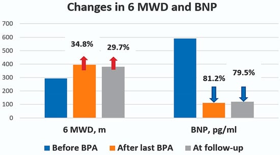 Percentage change: decrease in BNP (after the last BPA, the level of BNP decreased by 81.2% after last BPA from baseline and 79.5% at follow-up (blue arrows) and increase in 6MWD (after the last BPA, 6MWD increased by 34.8% after last BPA from baseline and 29.7% at follow-up (red arrows)). Abbreviations: BNP—brain natriuretic peptide; 6 MWD—6-min walk distance.
