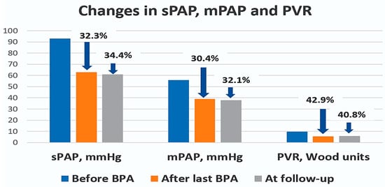 Percentage reduction in sPAP, mPAP, and PVR from pre-BPA baseline to last BPA procedure and from pre-BPA baseline to follow-up (blue arrows). Abbreviations: mPAP—mean pulmonary arterial pressure; sPAP—systolic pulmonary arterial pressure; PVR—pulmonary vascular resistance.
