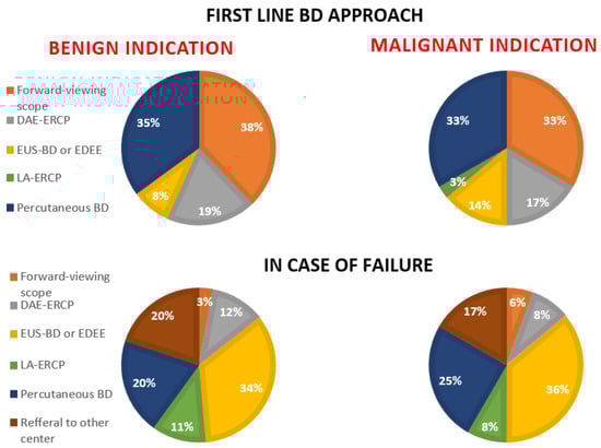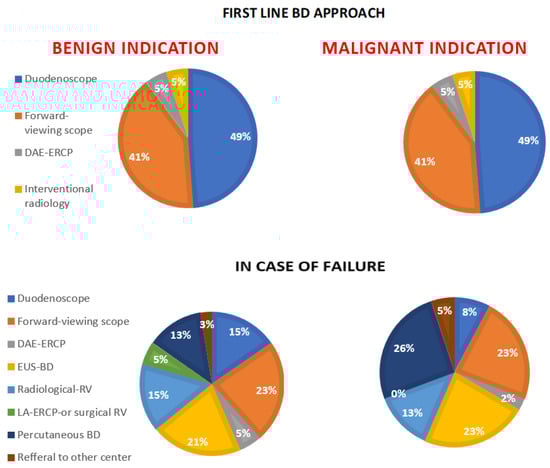 Endoscopic BD in the case of Roux-en-Y reconstruction is usually challenging considering the length of the afferent limb usually does not allow papilla or bilio-digestive anastomosis identification with standard endoscopes []. However, the length of the afferent limb is extremely variable and usually not known by the endoscopist []. This is probably the reason why almost one third of the participant centers declared that they try, as a first attempt, BD with a forward-viewing scope such as pediatric colonoscope or short enteroscope in order to try to reach the papilla. More advanced procedures such as EUS-BD or DAE-ERCP are less used compared to percutaneous BD, which, in one third of centers, is chosen as the first approach also in the case of benign disease. This result shows that, in the real world practice, the percutaneous BD approach is still frequently used, as also demonstrated by the study of Nennstiel et al. [], despite the high rate of adverse events and long-term management problems [,].
