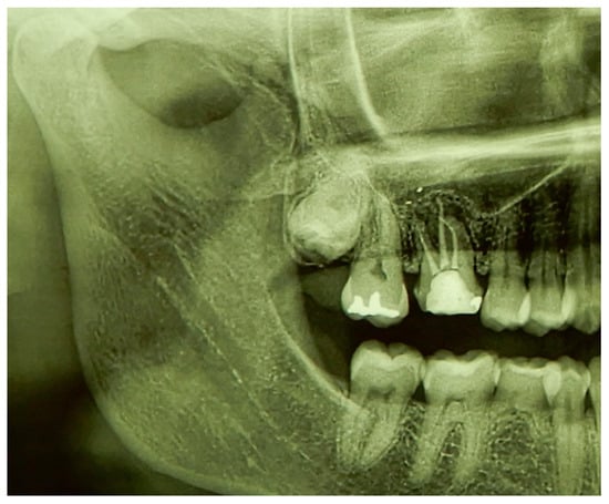 A female young adult patient (35 years old) came to the dental office complaining of widespread pain in the posterior sector of the upper dental arch. This persistent pain caused her a strong functional limitation in terms of both chewing and simple contact between the dental arches when at rest. Given the absence of clinical signs in the area affected by the symptoms (Figure 1), a dental radiograph was requested. The orthopanoramic radiograph of the dental arches revealed the presence of a periapical lesion on the first upper-right molar, which had already been treated endodontically and covered by a prosthetic crown (Figure 2). Furthermore, the third molar on the same side appeared impacted with the root apices closed (Figure 2). The therapeutic strategy involved the extraction of the first molar and, at the same time, the extraction and recovery of the third molar as a replacement dental element in place of the first molar, both of which were proposed to the patient. The presence of closed apices in the third molar, as explained to the patient, would require the endodontical treatment of the tooth following its insertion into the recipient site and its protection by means of prosthetic crown coverage. Despite the possibility of failure, the biological and economic advantage of this auto-transplantation was more reasonable for the patient compared to alternatives such as endodontic retreatment of the first molar, third molar extraction or extracting both elements and rehabilitation of the first molar edentulous area via prosthetic endosseous implant.