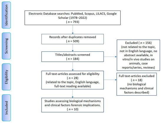 The database search initially yielded 793 results (PubMed, Scopus, Cochrane Library and LILACS) published between 1978 and 2023. Duplicates were manually removed. The remaining 184 results were checked for eligibility criteria by reading the abstracts. Following this step, 156 articles were excluded, since they did not meet the established eligibility criteria. Out of the remaining 28 articles that were assessed as eligible for full-text reading, 18 were excluded, since they reported no biological factors or mechanisms involved in third molar auto-transplantation. The ten articles left were included in the scoping review, since they assessed biological mechanisms and clinical factors with potential forensic implications (Table 3). From the supplemental research of the scientific sources herein included and cited, no further suitable studies were found (Figure 3). The scoping review relied on sources published over the past two decades, from 2002 to 2022. The total number of patients involved in the studies documenting the use of third molar auto-transplantation ultimately totaled 573 [,,,,,,,,,]. The distribution between the two sexes was not available; hence, no estimation based on this variable could be made as to the incidence of biological factors or mechanisms. Patients were in the 15–53 age range. Only three studies did not provide this information [,,]. As for the study types, five out of ten studies were retrospective [,,,,], two studies were observational [,], one study was comparative [], one was defined by its authors as prospective [] and one was registered as a clinical trial []. All but two studies [,] clarified the stage of formation of the third molars used for auto-transplantations. Three studies used third molars with an immature root formation stage [,,], three other studies referred to the use of third molars with fully mature roots [,,] and, finally, two other studies documented the use of both levels of root formation [,]. The most commonly used classification to define the stage of root maturation was Moorrees classification [,,,,]. Biological mechanisms and clinical factors, may have important forensic implications, turned out to be varied, including the timing of healing and bone formation, including transient mobility [,] and stimulation at bone deposition in deficient sites []; the effect of the forces expressed by adjacent teeth []; the root response according to the stage of root maturation [,]; the influence by the recipient bone according to its characteristics to be evaluated radiographically in growing subjects []; and the role of the periodontal ligament in surgery and over time [,,].