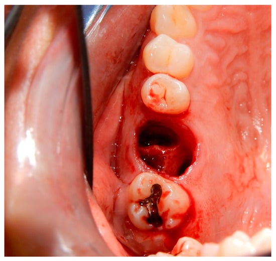 Post-extraction empty socket (of the upper-right first molar) from which the interradicular septum was removed to position and fit with the donor tooth (third molar).