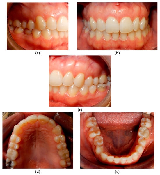 Final case photos. (a) Right side view; (b) frontal view; (c) left side view; (d) upper occlusal view; (e) lower occlusal view.