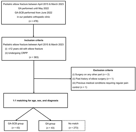 The inclusion criteria were patients < 12 years old who underwent CRPP for an elbow fracture as surgical treatment. The exclusion criteria were the following: (i) surgery on any other part of the body during hospitalization, (ii) past history of elbow surgery, (iii) underlying baseline medical conditions requiring regular pain management, (iv) open fractures, and (v) multiple fractures. Patients who met the inclusion criteria were grouped based on the anesthetic method followed, i.e., general anesthesia (GA) and GA-followed-by-supraclavicular-brachial-plexus-block (GA-SCB). At our hospital, GA was performed for pediatric elbow fracture patients until May 2022, and the GA-followed-by-SCB was performed since June 2022. Therefore, patients who underwent GA were matched in a 1:1 ratio with patients from the GA-SCB group for sex, age, and diagnosis. The most recent GA patient was selected when two or more candidates were available. For this study, the elbow fractures for which CRPP was performed were supracondylar humerus fracture (SCHF), lateral condylar fracture (LCF), and radial neck fracture (RNF). No patients needed tourniquet during procedures due to CRPP.