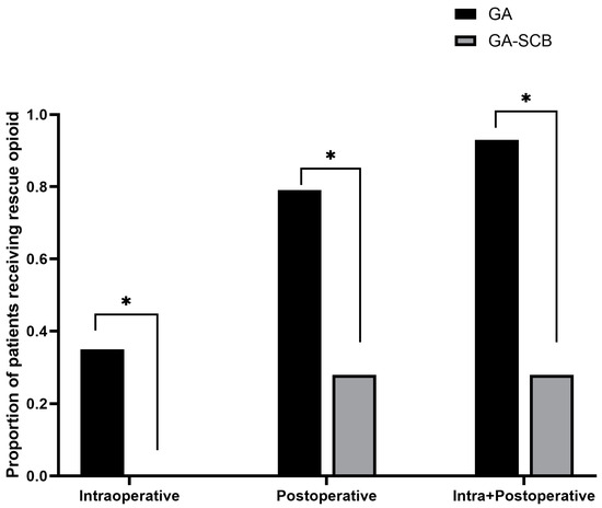 Proportion of patients that were administered rescue opioids (* p < 0.001). GA, general anesthesia; GA-SCB, general anesthesia-supraclavicular brachial plexus block.