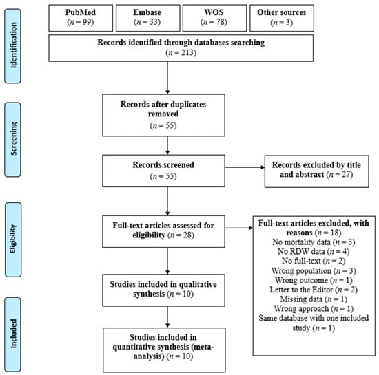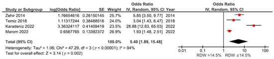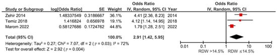 - Wu, H.; Liao, B.; Cao, T.; Ji, T.; Huang, J.; Ma, K. Diagnostic value of RDW for the prediction of mortality in adult sepsis patients: A systematic review and meta-analysis. Front. Immunol. 2022, 13, 997853. [Google Scholar] [CrossRef] [PubMed]
