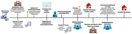 Timeline of the case of subarachnoid neurocysticercosis, illustrating the chronological sequence of events. Created with BioRender.com.