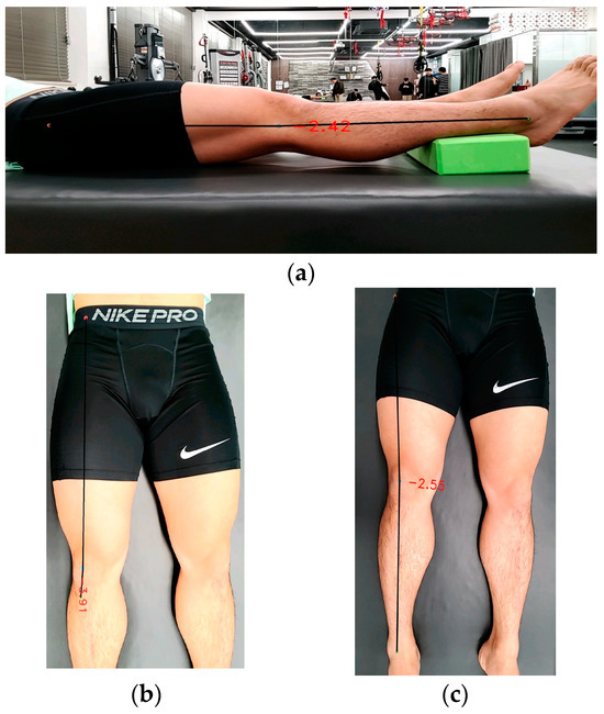 Lower extremity alignment measurement in the supine position. (a) Genu recurvatum. (b) Q-angle. (c) Tibiofemoral angle.