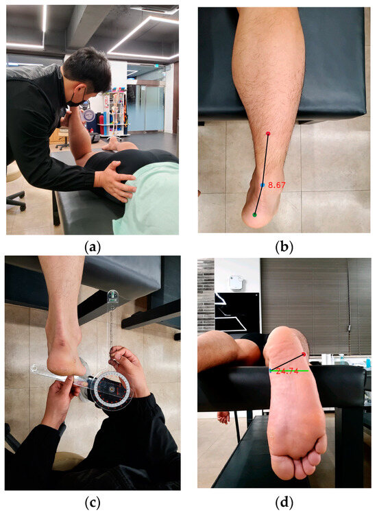 Hip anteversion was measured in the prone position. The femur was placed in a neutral position, the knee was flexed at 90°, and one hand was placed over the GT. The leg was rotated until the most predominant part of the GT was palpated. An inclinometer was then placed on the lower third of the medial surface of the tibia to measure the angle (Figure 3a). To measure the rearfoot, the femur and subtalar joint were placed in a neutral position. Then, dots were marked at 1/3 of the lower leg, the midpoints of both malleoli, and the calcaneus (Figure 3b). To measure the forefoot, the subtalar joint was placed in a neutral position, and the angle between the plantar surface of the forefoot and the imaginary axis was measured using a goniometer (Figure 3c). To measure tibial rotation, the femur was placed in a neutral position, and the angle formed by the imaginary line connecting both malleoli bones on the sole of the foot and the angle to the imaginary parallel line was measured (Figure 3d).