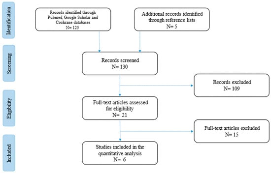 Our search strategy permitted the identification of 130 papers, of which 124 were excluded by title and abstract evaluation. Then, the reviewers studied titles and abstracts. Subsequently, 6 papers were included. Finally, quality assessment of full-text studies was performed by two independent reviewers (ES and TL). Researchers reviewed the summary of all articles sought and ultimately used data from full articles to compile this review paper. Researchers assessed the inclusion of all titles and abstracts without language limitations in English. We duplicated other studies previously included and excluded papers with no methods described, along with papers not strictly related to the aim of the study and according to journal importance and the number of references.