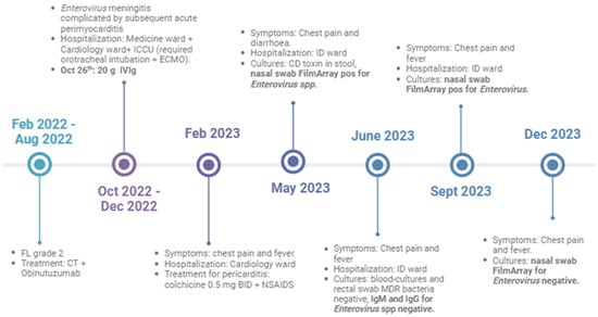 Timeline of Clinical and Microbiological Presentation of Disseminated Enterovirus infection after Obinutuzumab. Abbreviation: FL: follicular lymphoma; CT: chemotherapy; ICCU: intensive coronary care unit: ECMO: extra-corporeal membrane oxygenation; IV: intravenous; IVIg: intravenous immunoglobulin; BID: bis in die: NSAIDs: non-steroidal anti-inflammatory drugs; ID: Infectious Disease; CD: Clostridioides difficile; MDR: multi-drug resistant. Created with BioRender.com (accessed on 17 March 2024).