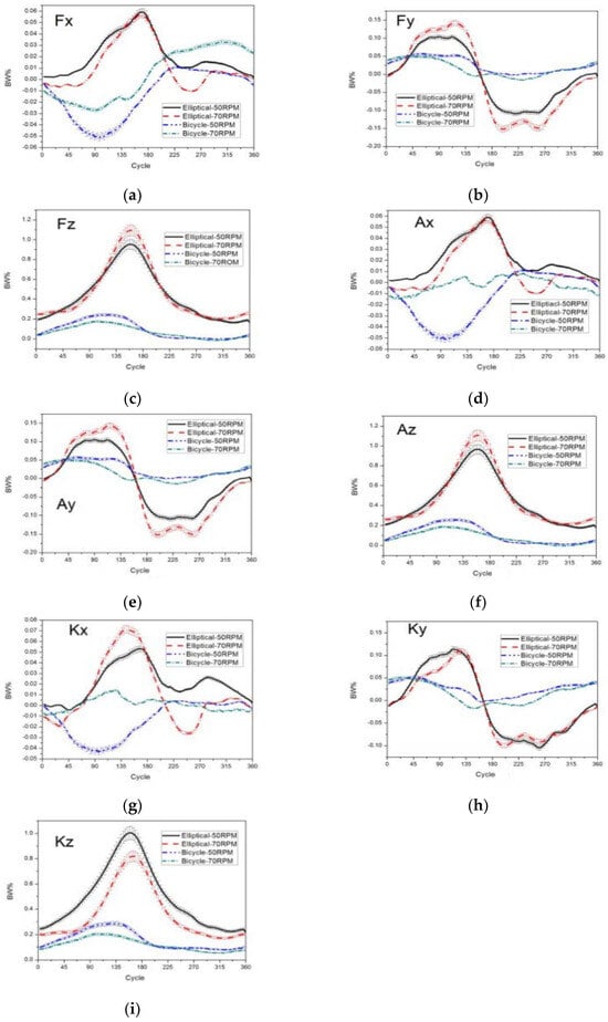 This section provides an in-depth analysis and comparison of the peak values of the pedal reaction force, ankle joint force, and knee joint force in both the horizontal and vertical planes across various speeds for both stationary bikes and elliptical machines. Detailed visual representations of these comparisons are presented in Figure 7.