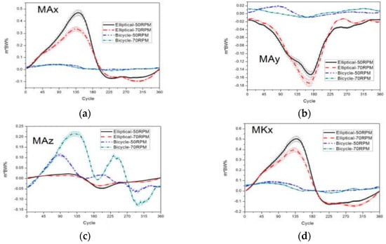 The peak joint torque during cycling was observed to occur earlier in the pedal stroke, specifically between 70° and 110°, compared to the elliptical machine, where it manifested between 135° and 180°. This distinction is attributable to the seated position in cycling versus the standing position on the elliptical machine, resulting in a shift in the center of gravity with the elliptical machine and thus a delayed onset of joint torque. Furthermore, the peak ankle and knee joint torques in the horizontal plane during the use of the elliptical machine were observed later than the peak ankle torque, specifically between 160° and 180°. This timing coincides with the later onset of the pedal reaction force in the horizontal plane. Previous research by Jian disclosed that the peak ankle torque in the horizontal plane is the lowest among all directions in the joint torque curve of the elliptical machine [38], corroborating the findings of the present study. Significant variations in torque values at the ankle joint were found due to the differences in joint angles between the two exercise machines. Additionally, the peak joint torque for all joints was elevated during high-speed pedaling compared to low-speed pedaling for both machines. Therefore, to avert joint injuries, the ability to tolerate the pace of the exercise machine must be considered when utilizing these devices.