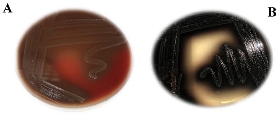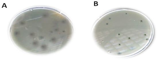 According to Thung et al. [26], phages were isolated and cultured subsequently from plaque isolates, and these plaques were inoculated in 1 mL of nutrient broth, which included 100 µL of two host bacterial isolates, and then incubated at 37 °C with a speed of 120 rpm on an incubator shaker. After incubation, chloroform was added, and the mixture was centrifuged again at 10,000 rpm for 15 min. The supernatants containing our phages were purified via filtration through a 0.22 μm Millipore filter membrane (Minisart, Sartorius, Songdo, Republic of Korea) and then stored as bacteriophage stock at a low temperature (4 °C). Then, 0.5 mL of supernatant was mixed with 1 mL of bacteria and incubated at 37 °C for 30 min. Then, the mixture was added to 3 mL of semi-solid TSB and poured over solid TSA agar plates. The plates were kept at 37 °C for one day, then examined for lysis zone formation.