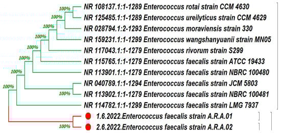 Two isolates of E. faecalis were used as hosts for the isolation of bacteriophages, as confirmed by the 16s RNA gene sequence. The obtained DNA sequence of the partial 16S RNA gene displayed a high similarity to the E. faecalis strain’s 16S ribosomal DNA gene. A phylogenetic tree between these strains and the closely resembled sequences was constructed using MEGA11 software (v11.0.13) (Figure 2).