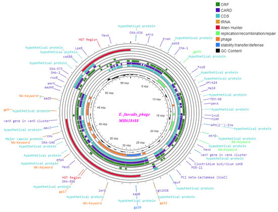 The total genome length of Enterococcus_phage-01 and phage-02 was determined to be 57.8 kb, with a GC content of 40% (Figure 5). Furthermore, in silico analysis and annotations of the phage genome revealed that a total of 69 open reading frames (ORFs) included 53 located on the indirect strand and 16 on the direct strand (Figure 6). All coding sequences were found to initiate with the ATG start codon. The functional proteins were categorized as follows: (i) Protein families involved in the integration, excision, replication, recombination, repair, stability, defense, or transfer of bacterial mobile genetic elements and phages. Among the predicted ORFs, 19 were associated with mobile orthologous groups. Within these groups, 13 ORFs (68.42%) were predicted to encode proteins involved in phage-related biological processes, such as structural proteins and lysogeny-associated machinery. Additionally, four ORFs (21.05%) were predicted to encode proteins involved in replication, recombination, or repair (RRR), including gp59 and efb37. Two ORFs (10.52%) were anticipated to be associated with the stability, transfer, and defense (STD) of elements from the host machinery or other elements, including gp20 (see Table 4). (ii) Regarding host lysis and adhesion proteins, an analysis using BLASTP on the Enterococcus phage genome showed the absence of genes encoding CRISPR-Finder. Additionally, no similarities were found with genes encoding integrase or excisionase. Furthermore, searches against various databases, such as VFDB (Virulence Factor Database), Virulence Finder 2.0, and PAIDB (Pathogenicity Island Database), yielded no results. Conversely, when the Enterococcus phage genome was analyzed against the Comprehensive Antibiotic Resistance Database (CARD), a total of 77 comprehensive antibiotic resistance genes were identified. Table S1 summarizes these genes, including their start and end positions, lengths, strands, gene names, drug classes, AMR gene families, and resistance mechanisms.