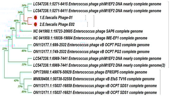 The two bacteriophages were identified genetically and recorded on GenBank under accession numbers E. faecalis_phage-01 genome (ON809698) and E. faecalis_phage-02 genome (ON809699). Phylogenetic analyses of the 16S rRNA gene sequences were conducted with MEGA software version 4 (MEGA4). Trees were constructed using the neighbor-joining method based on the maximum composite likelihood model. Phylogenies were also evaluated by the maximum parsimony method and the unweighted pair group method with arithmetic mean (UPGMA) and found to be similar (Figure 7).