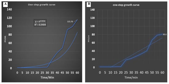 A one-step growth curve was obtained for each of the two isolated phages (Figure 8). The Siphoviridae phage (E. faecalis_phage-01) had a burst size of 115.7 PFU/mL with latent periods of 30 min (Figure 8A), and the Myoviridae phage (E. faecalis_phage-02) had a burst size of 80.6 PFU/mL with a latent period of 25 min (Figure 8B). These results are comparable to those reported in previous studies using E. faecalis phages, where the average burst sizes of such phages were approximately 36–122 PFU/mL and the latent periods were 25–50 min.
