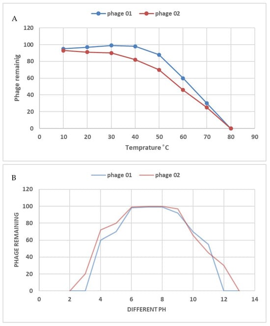 Phage thermal stability was measured by adding 100 µL of phage lysate to prewarmed 0.22 m filter-sterilized SM buffer. For a period of one hour, the tubes were incubated at different temperatures ranging from 10 °C to 80 °C. Aliquots were obtained and phage titers were calculated after 60 min of incubation. To test pH stability, sterile SM buffer with pH values ranging from 2 to 13 that had been altered with NaOH and HCl was added to 100 µL of phage lysates. Sixty minutes were spent incubating the tubes at 37 °C. The two-layer agar method was used to detect the phage titers in bacterial hosts after the phage solution had been serially diluted [33]. The median of the triplicate counts was obtained for each temperature, besides the pH treatment that was carried out in triplicate. Phage heat/pH stability (%) = initial phage titer before treatment × 100% × (phage titer regained after treatment).