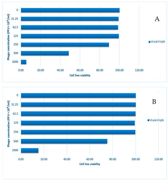 Using the agar overlay technique [26], crude lysates were counted and viability was determined prior to use. Each crude lysate was treated with NaCl to obtain a final concentration of 1 M and stored at −20 °C for 1 h, followed by centrifugation at 11,000× g and 4 °C for 10 min. Following centrifugation, the supernatant was treated with 10% (w/v) polyethylene glycol 8000 (PEG 8000) and stored at 4 °C for 18 h. The suspensions were centrifuged at 11,000× g for 10 min at 4 °C, the supernatant was discarded, and the pellet was resuspended in 1 mL of chloroform and 11 mL of λ buffer. Centrifugation at 3000× g and 4 °C for 15 min separated the organic and aqueous phases. The organic phase was removed after centrifugation at 3000× g/15 min and 4 °C, and the aqueous phase was made up to 50 mL with buffer λ, then filtered twice through 0.45 μm filters. Purified phage preparations were diluted in λ buffer to achieve an active solution with a concentration of 8 × 109 PFU/mL and quantified using the agar overlay method as previously described [26]. Buffer was stored in a sterile glass container at 2–8 °C. Before being used in cytotoxicity experiments, phages were diluted in buffer λ to yield 2 × 109.2 × 108 and 2 × 107 pfu/mL and then weighed by suspension at ordinary temperature.