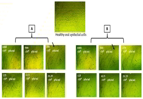 Cytotoxicity of E. faecalis bacteriophages (pfu × 106)/mL (A) E. faecalis_phage-01 (B) E. faecalis_phage-02 on oral epithelial cells. Where black arrows showed some of available cells within test sample.
