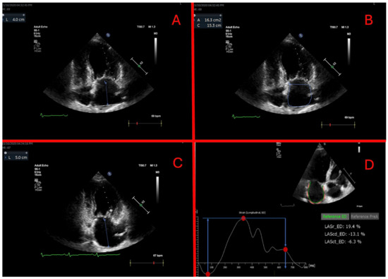 Left atrium morphometric measurements and strain analysis. (A) left atrial length in 4-chamber view at end-diastole; (B) left atrial area in 4-chamber view at end-diastole; (C) left atrial length in 2-chamber view at pre-atrial contraction; (D) left atrial strain measurements. Reservoir strain is calculated as a positive value, conduit and contractile strains as negative values.