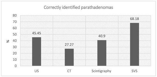 The localization of parathyroid adenomas, a crucial aspect of our investigation, yielded distinct results. Among the non-invasive radiological diagnostic methods employed, ultrasound (US) correctly identified the localization in 10 out of 22 cases (45.45%), computed tomography (CT) in 6 out of 22 cases (27.27%), and scintigraphy in 9 out of 22 cases (40.9%). However, the standout performance was attributed to SVS, which demonstrated superior accuracy in precisely lateralizing the adenoma, correctly identifying it in 15 out of 22 cases (68.18%). This emphasizes SVS as the most accurate preoperative method for determining adenoma lateralization (Figure 1).