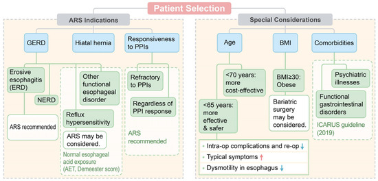 ARS can be an effective treatment for refractory GERD, with its desirable outcomes and cost-effectiveness. However, it is important to select appropriate candidates for ARS, considering the relatively low surgical effectiveness in PPI non-responders compared to PPI responders, irreversibility of surgery, and possible complications after ARS. Figure 1 shows the current indications for ARS and the areas of special consideration in patient selection.