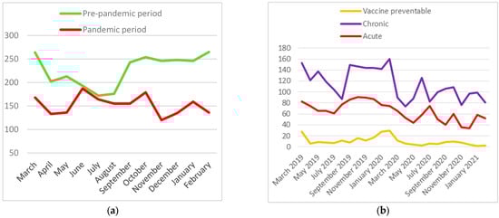 In Figure 2b, we show the number of vaccine-preventable, chronic, and acute ACSC hospitalizations. In the pre-pandemic period, vaccine-preventable ACSC hospitalizations accounted for 6.6% of all ACSC hospitalizations, chronic ACSCs for 59.1%, and acute ACSCs for 34.3%. However, this distribution of the ACSC categories significantly changes in the pandemic period (χ2 = 15.8, p = 0.0004). The percentage of vaccine-preventable ACSC hospitalizations drops and of the number chronic ACSC hospitalizations rises. The percentage of acute ACSC hospitalizations was found to be approximately the same in both periods. In the pandemic period, vaccine-preventable ACSC hospitalizations accounted for 3.9%, chronic ACSCs for 61.8%, and acute ACSCs for 34.3% of all ACSC hospitalizations. Chronic ACSC hospitalizations were in the majority in both observed periods.