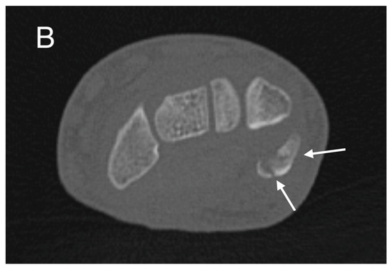 Initial CT study with sagittal (A) and axial (B) images showing a non-displaced fracture of the pisiform bone (white arrows).