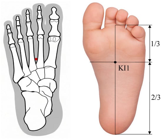 On the other hand, based on clinical and preclinical studies, the KI1 acupoint (Yongquan) is thought to be effective in improving consciousness disorders, enhancing neuronal synaptic plasticity, mitigating neuroinflammation, and reducing thermal hyperalgesia [,,,,]. The location of the KI1 acupoint is approximately at the junction of the anterior third and the posterior two-thirds of the line connecting the heel to the web margin, between the 2nd and 3rd metatarsal bones [] (Figure 1). However, anatomical studies, especially regarding the nerves and muscles as the basis for the therapeutic action of the KI1 acupoint, have been rare. This research aims to uncover the therapeutic mechanisms of the KI1 acupoint through precise anatomical studies on cadavers.