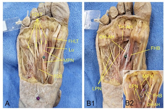 This study has several limitations. The reliance on anatomical dissections underscores the need for further in vivo research and studies involving living human subjects to accurately assess the physiological effects of acupuncture. The dynamic properties inherent in living tissue, crucial for directly observing the impacts on neural activities and pain management, cannot be fully replicated in cadaveric samples. Additionally, the study’s use of a limited number of cadavers, specifically three men and three women of advanced age, introduces potential biases. All participants were over 80 years old, which may not represent the broader population due to age-related physical conditions. There is a report showing foot-shape changes with age, especially in women []. Moreover, recent studies have observed variations in the structures of the sole in some anatomical cases, including the flexor digitorum accessorius muscle [], which could alter the relationship between acupoints and their surrounding anatomy. These limitations restrict the generalizability of our findings and highlights the importance of considering a more diverse demographic and anatomical variations in future research.