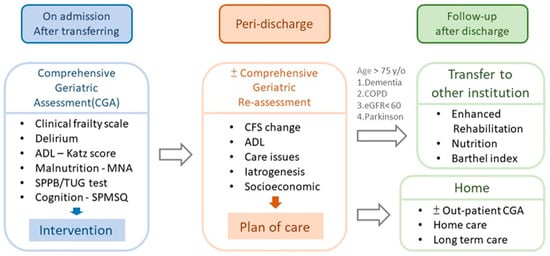 Multidisciplinary care and follow-up in geriatric care. Note: ADLs, activities of daily living; COPD, chronic obstructive pulmonary disease; eGFR, estimated glomerular filtration rate; CFS, clinical frailty scale; MNA, mini nutrition assessment; SPPB, Short Physical Performance Battery; TUG test, Timed Up and Go test; SPMSQ, Short Portable Mental Status Questionnaire.