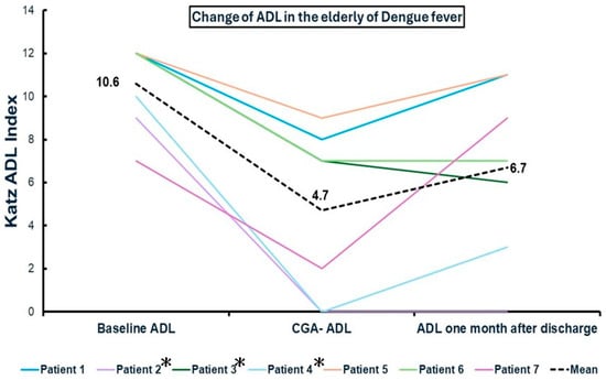 Change in the Katz ADL index from baseline before dengue, at hospitalization, and 1 month after discharge. Note: Patient 2 died from choking before the final assessment. CGA, comprehensive geriatric assessment; ADLs, activities of daily living. Patients 2, 3, 4 *: patients with poor Short Portable Mental Status Questionnaire score.