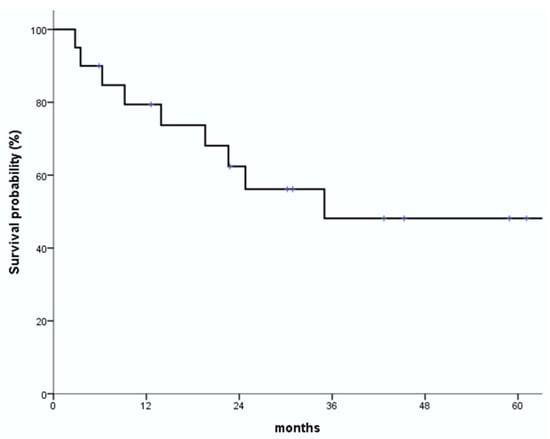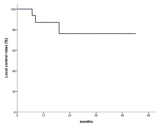The median follow-up period in the study was 15.8 months (range: 2.7–53.8 months). During follow-up, 10 of the 20 patients (50.0%) showed a complete response (CR), five (25.0%) showed a partial response (PR), two (10.0%) had stable disease (SD), and three (15.0%) had progressive disease (PD). Overall, the response rate during follow-up was 75%. Fourteen patients were alive with no evidence of disease or with controlled disease until the last follow-up. One-year and 2-year OS rates were 79.4% and 62.4%, respectively, and the corresponding LC rates were 87.1% and 76.2%, respectively (Figure 1 and Figure 2). Eight patients died due to a non-radiation therapy cause, including six who died due to disease progression.