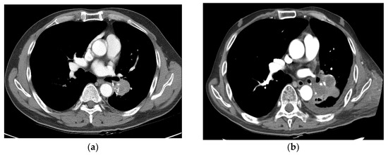 Case 2 (patient no. 15). (a) A 58-year-old man was initially diagnosed with NSCLC of stage pT2bN0M0 (stage IIA) after left lower lobectomy. A recurrent tumor at the LLL operation site (left subaortic area) was noted. He underwent SBRT at 50 Gy in 10 fractions. (b) Follow-up imaging at 6.8 months showing PD after SBRT. NSCLC, non-small cell lung cancer; SBRT, stereotactic body radiotherapy; PD, progressive disease; LLL, left lower lobe.