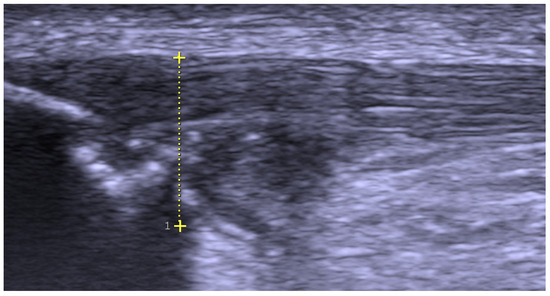 Greyscale ultrasound examination—longitudinal view of a patient with proximal patellar tendinopathy. There is a thickening of the proximal patellar tendon (marked) including tendinopathy on the dorsal side and a suspected partial rupture in close relation to a sharp bone edge in the patellar tip.