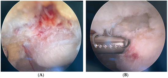 The patients were operated on in a supine position with a straight knee and relaxed quadriceps without a tourniquet. We used a pressure-controlled pump (Arthrex, Naples, FL, USA). A standard arthroscopic evaluation of the whole knee joint was performed. In the case of an obliterating suprapatellar or a prominent medial plica, these were routinely resected. Then, the patella tendon insertion into the patella was identified, and a 4.5 mm full radius blade shaver (Arthrex, Naples, FL, USA) was introduced. Simultaneous per-operative US examination (longitudinal and transversal views) guided the procedure. Careful shaving, aiming to destroy only the region with high blood flow and nerves adjacent to the tendinosis changes on the dorsal side of the tendon (separating the Hoffa fat pad from the patellar tendon), was performed. Extensive fat pad resection was avoided. In cases with a bone spur/sharp edge in or a loose bone fragment below the patellar tip, careful removal with the shaver and a ball end mill (Arthrex, Naples, FL, USA) was performed. It was often necessary to remove some tendinosis tissue and poor-quality ruptured tissue to reach the sharp bone, but emphasis was put on preserving tendon tissue. In direct relation to these patellar bony prominences, there were always partial tendon ruptures of varying sizes, appearing as a painful hole in the tendon with often richly vascularised walls (Figure 2A,B). The partial tendon rupture was debrided until fresh borders. Sometimes, 3–5 mL of additional local anaesthesia (Xylocain + adrenalin 10 mg/mL + 5 μg/mL, Aspen, South Africa) was needed to be injected into the site for the partial rupture allowing for a continued pain-free procedure. The portals were closed using single non-resorbable sutures, which were removed after one week, and 20 mL of a long-acting local anaesthetic (Ropivacain 10 mg/mL, Fresenius Kabi AB, Sweden) was injected into the joint.