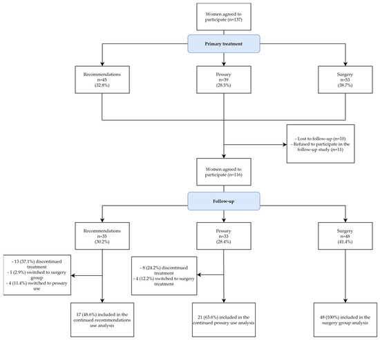 - Van der Vaart, L.R.; Vollebregt, A.; Milani, A.L.; Lagro-Janssen, A.L.; Duijnhoven, R.G.; Roovers, J.P.W.R.; Van der Vaart, C.H. Pessary or surgery for a symptomatic pelvic organ prolapse: The PEOPLE study, a multicentre prospective cohort study. Int. J. Obstet. Gynaecol. 2022, 129, 820–829. [Google Scholar] [CrossRef]